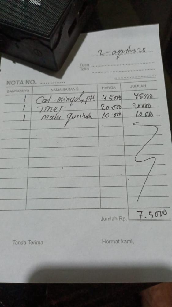 Beli cat minyak tinner dan mata gurinda untuk pemasangan papan petunjuk masjid
