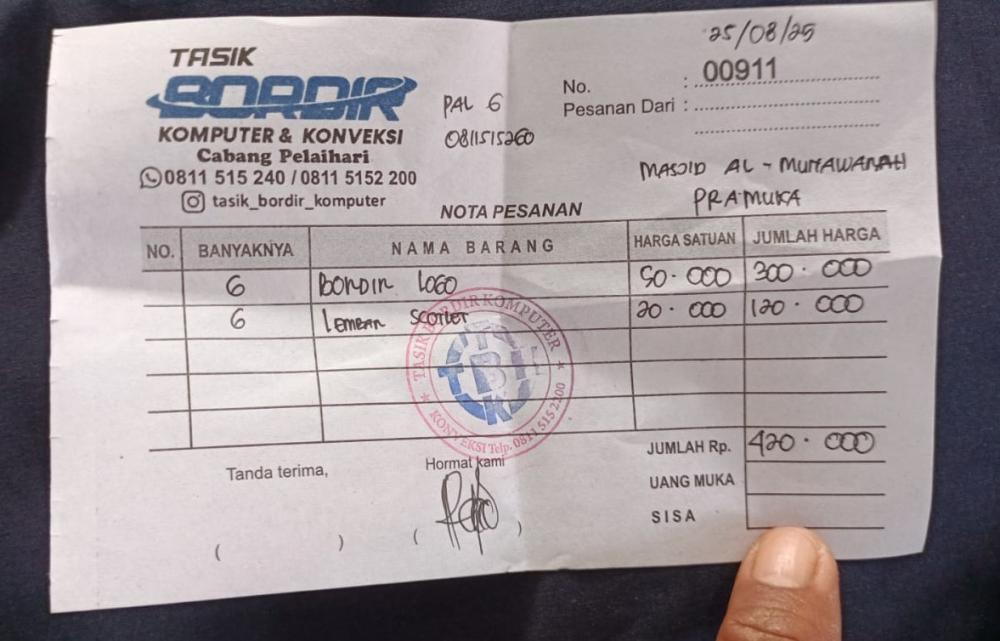 Biaya pengerjaan Bordir dan Skotlet untuk 6 buah Rompi Relawan Masjid