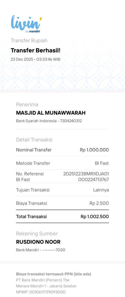 Transport untuk mengambil Ampli Masjid selesai service (beli bensin)