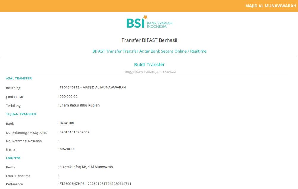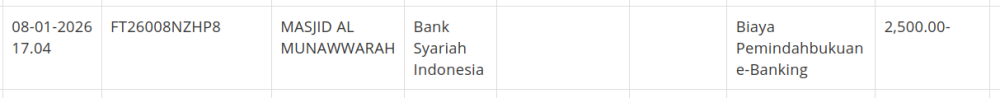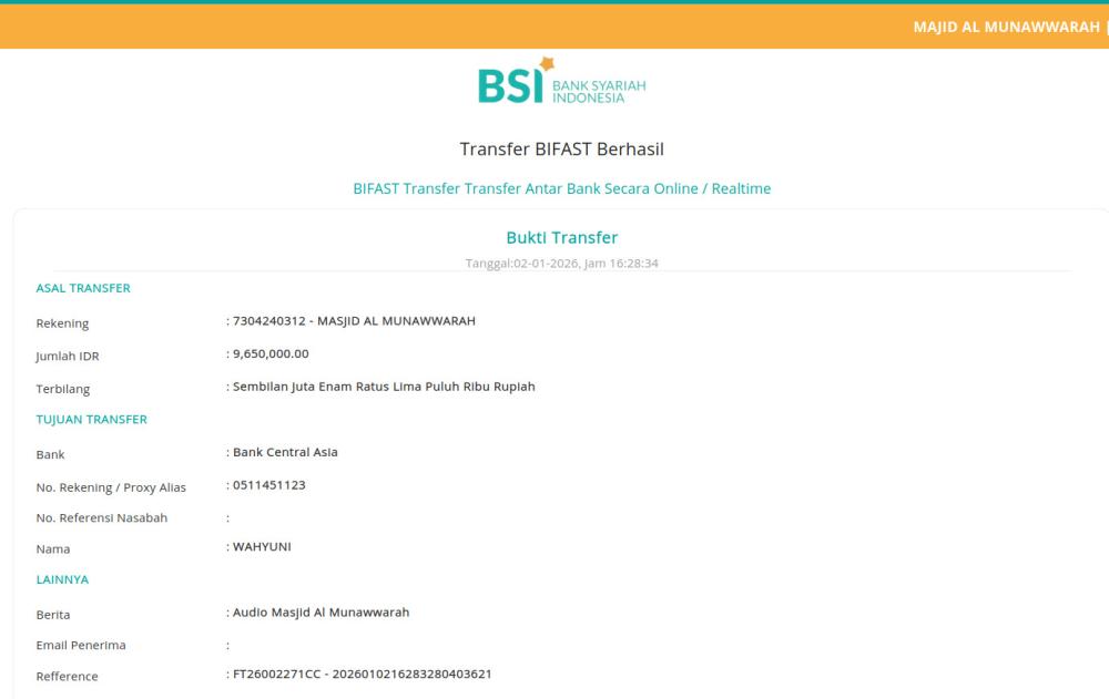 Biaya admin transfer bank untuk pembayaran audio masjid (transfer ke BCA an. Wahyuni