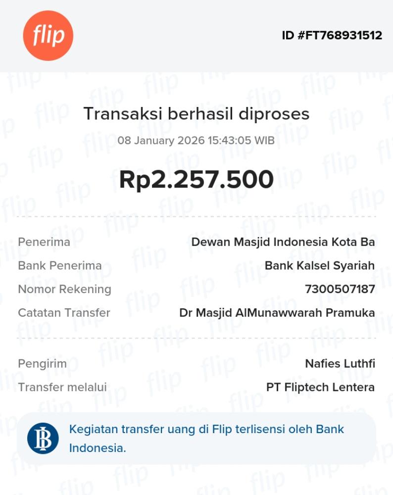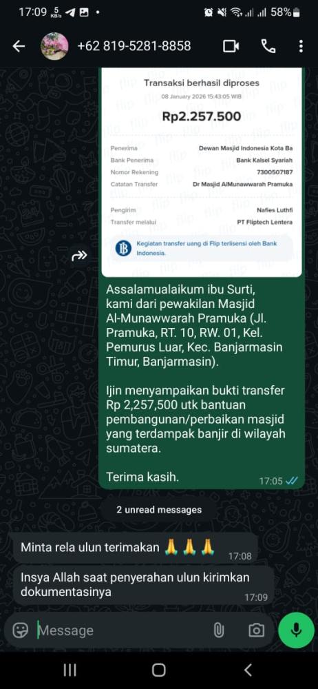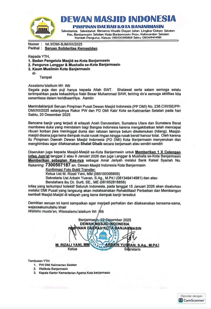 Penyaluran infaq jumat melalui Dewan Masjid Indonesia Wilayah Kota Banjarmasin untuk pembangunan/perbaikan masjid yang terdampak banjir di wilayah Sumatera.