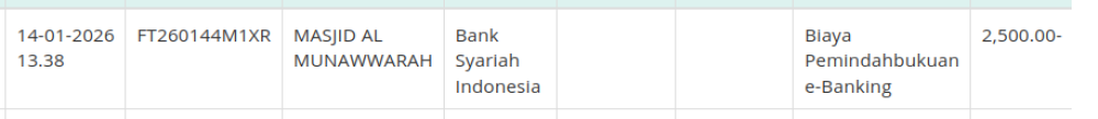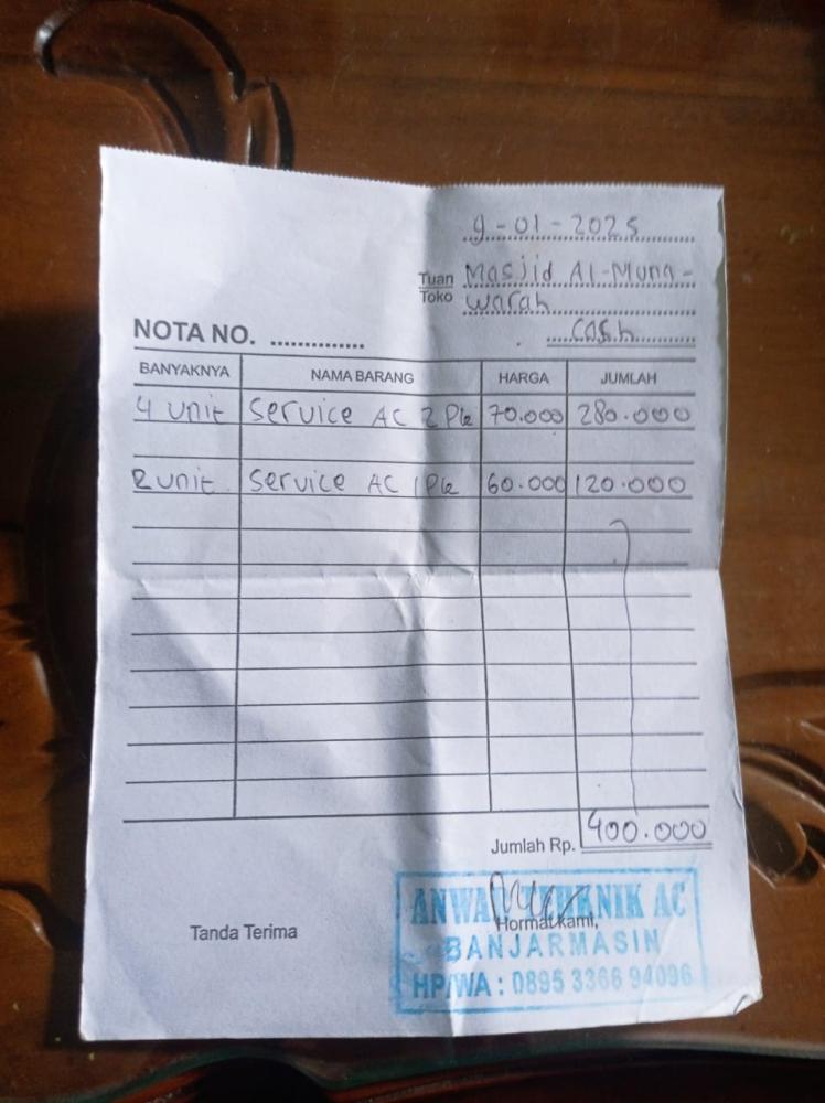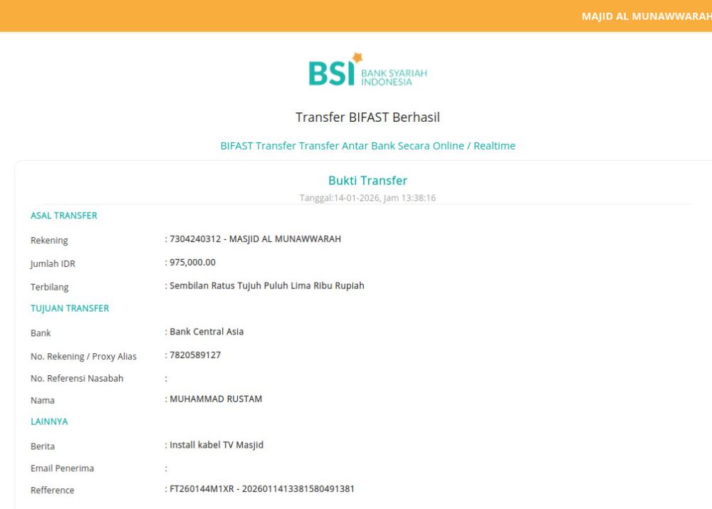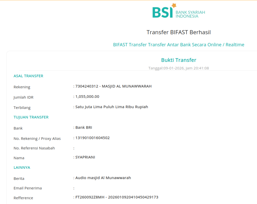 Biaya admin transfer bank untuk beli aksesoris, ject, kabel, dan biaya install audio masjid (transfer ke BRI an. Syapriani)