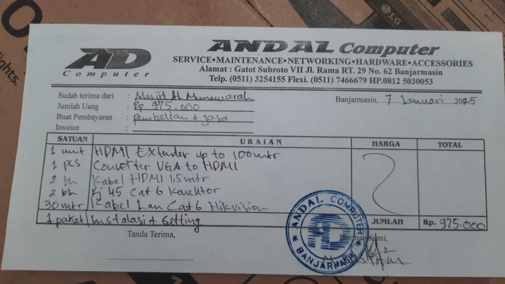 Biaya Perangkat dan Jasa install kabel TV display di ruang belakang tangga masjid