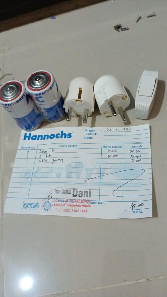 Beli Baterai Radio 2 biji, 2 Steker broco, 1 Saklar gantung