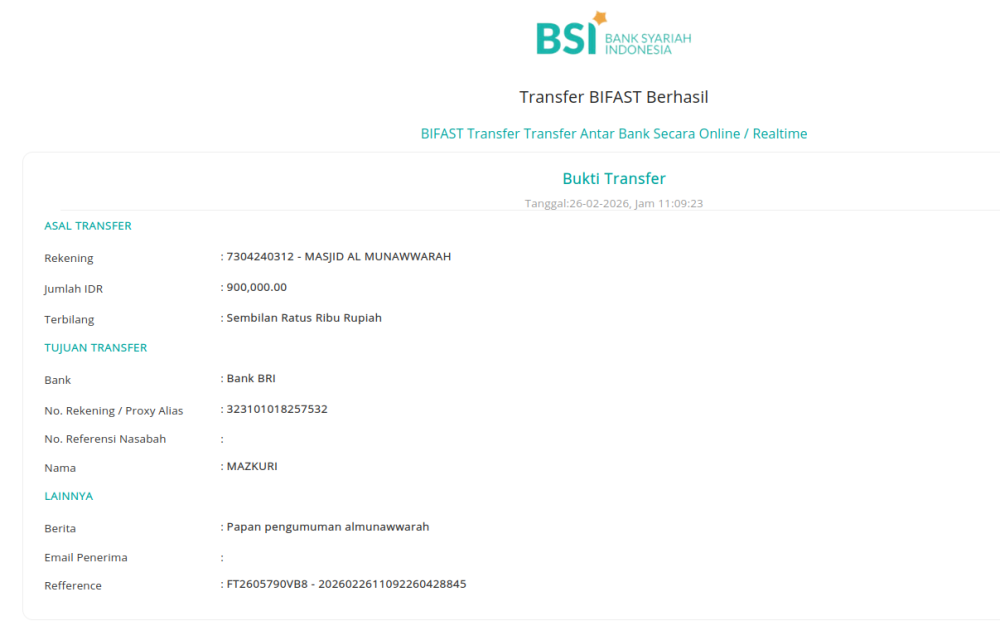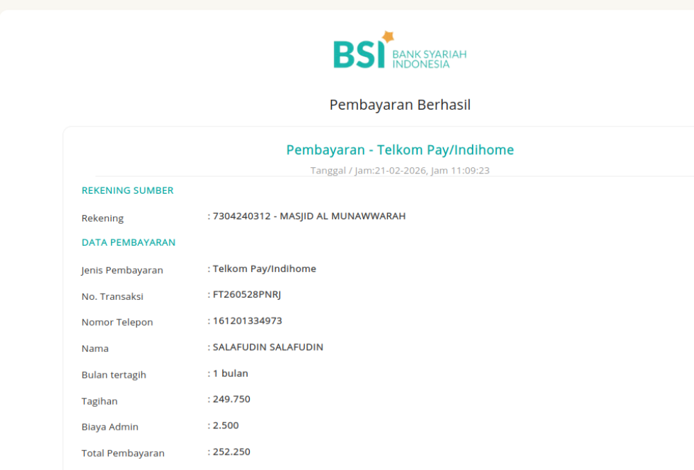 Infaq donatur untuk pembayaran PLN masjid bulan Februari 2026