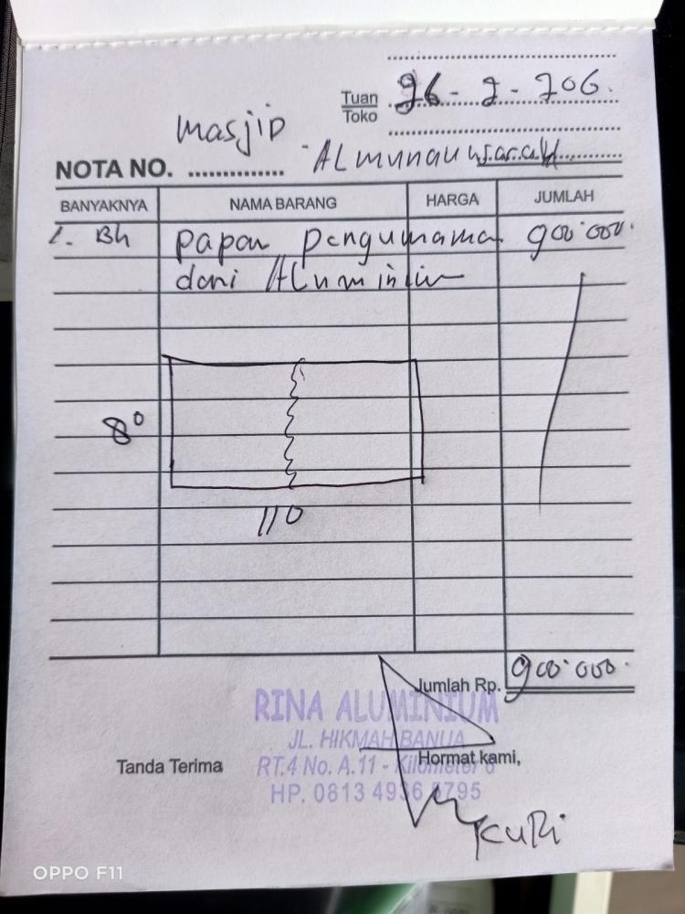 Pembayaran biaya pembuatan papan pengumuman masjid
